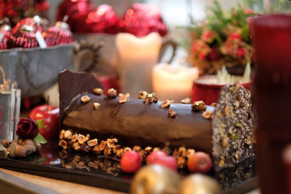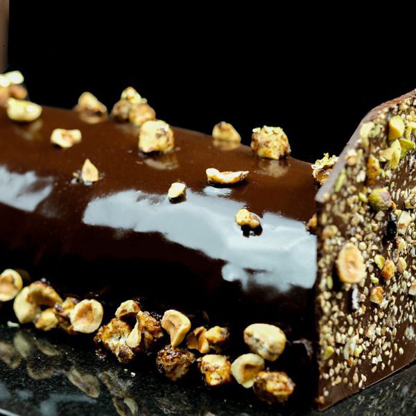 An indulgently rich chocolate yule log, generously topped with an array of nuts: so moreish, it’s hard to resist having only one slice!